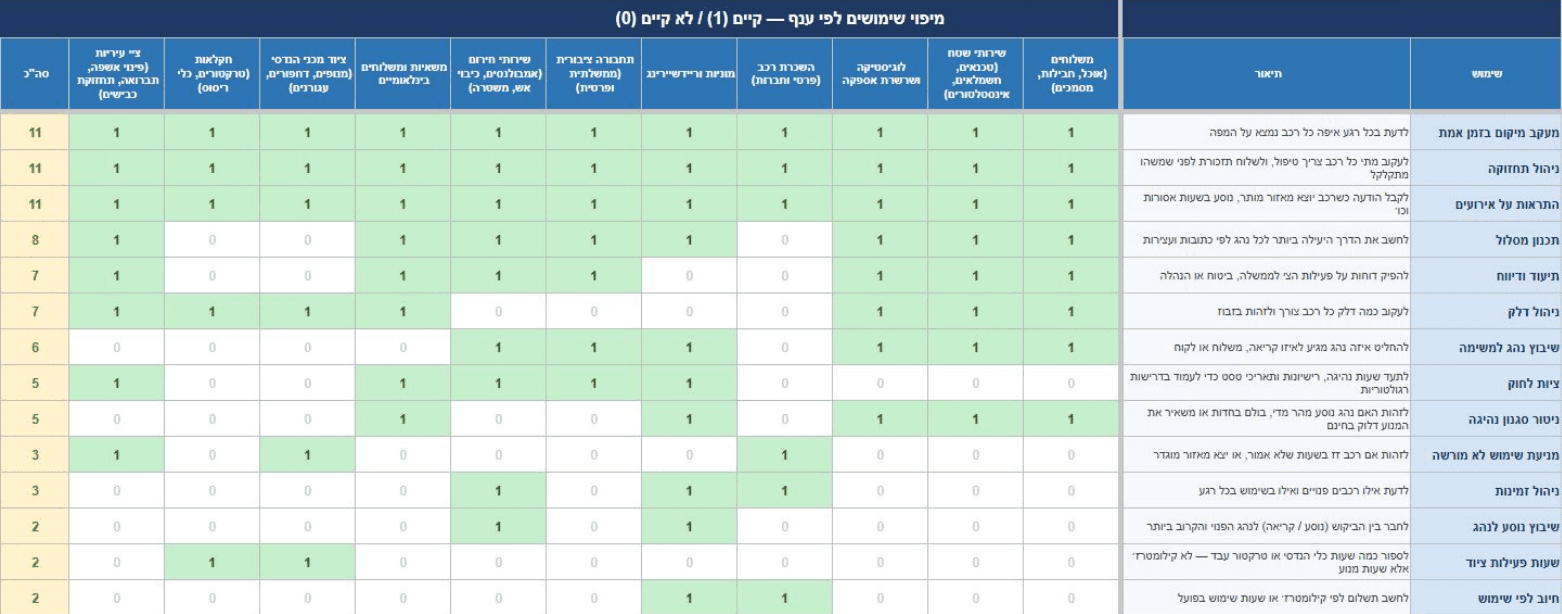 I mapped 14 use cases across six fleet types using a binary scoring system to identify which appear universally, regardless of industry. Three rose to the top with maximum breadth scores of 11/11: Real-time location tracking, Maintenance management, and Event & exception alerts.