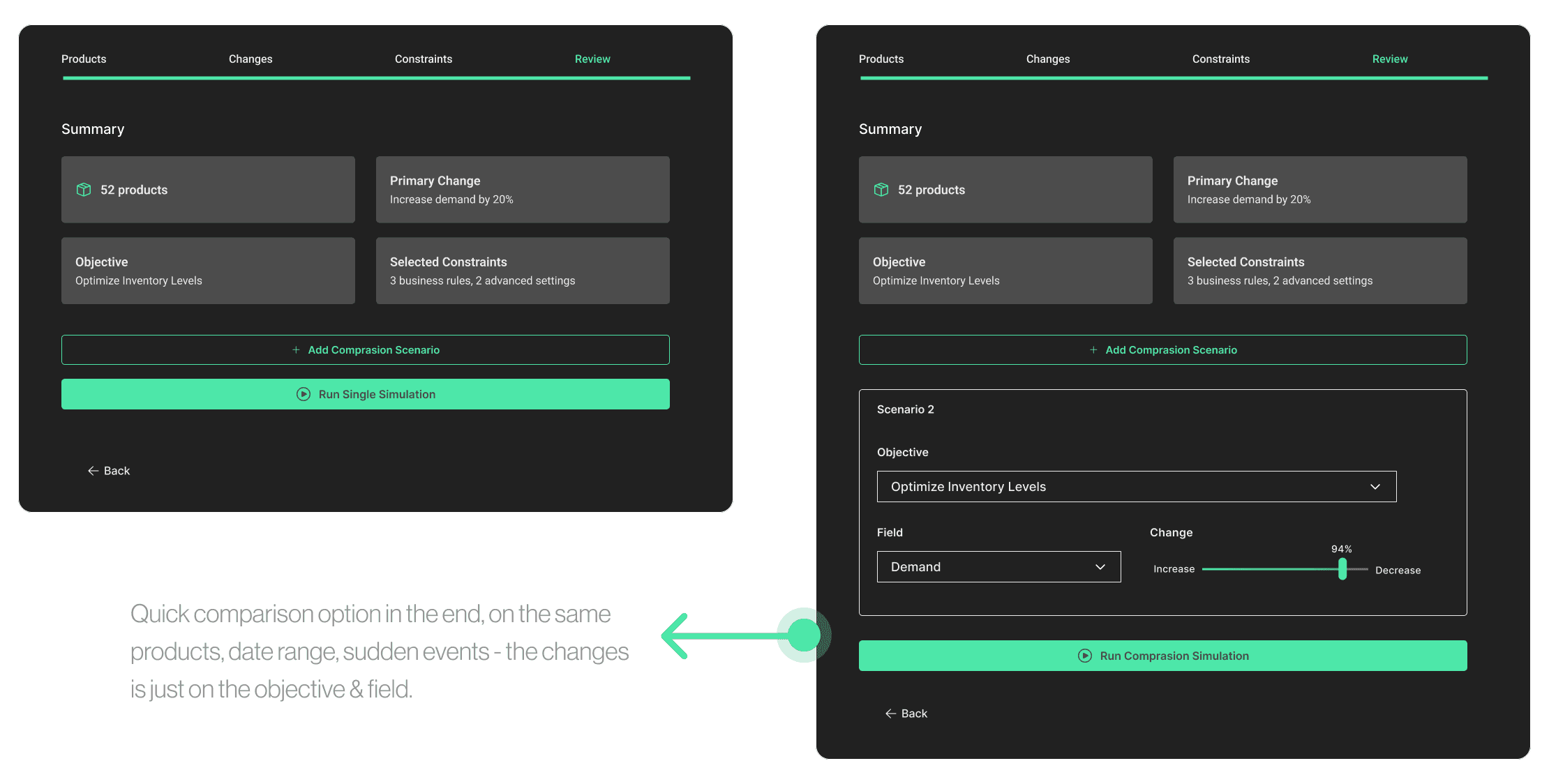 I designed a system that lets users configure complex simulations by adjusting any parameter — pricing, inventory levels, demand forecasts, supply timelines, and risk scenarios.