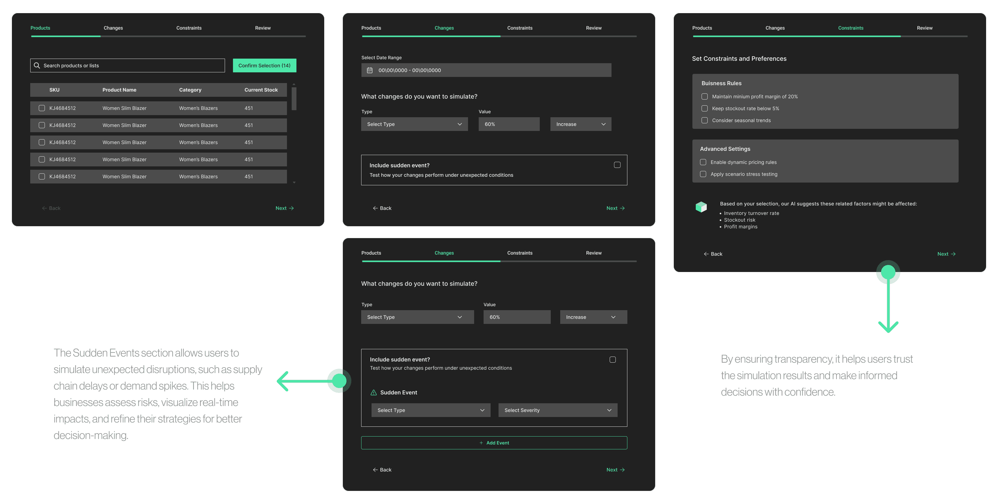 Users move from product selection → constraint setting → scenario generation, with contextual guidance at each step.